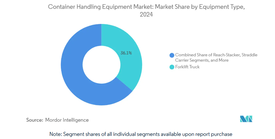 フォークリフトはコンテナハンドリング機器市場の主力として確固たる地位を保っています。しかしながら、ターミナルが無人・24時間稼働を目指す中、自動搬送車(AGV)が長期的な設備投資計画を再構築しつつあります。