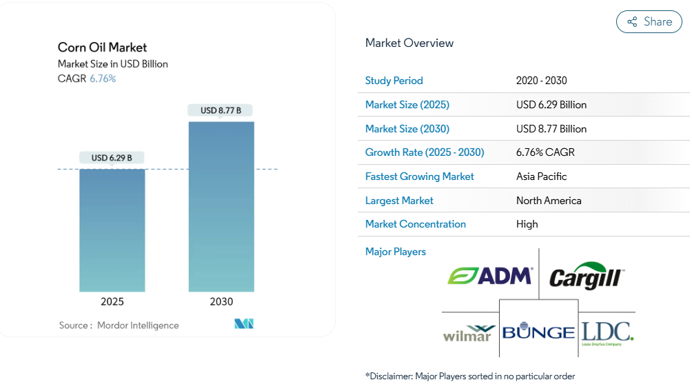 フリントヒルズ・リソーシズ、POET、グリーンプレインズといった地域企業は、酵素回収技術を活用して蒸留コーン油ストリームの収益化を強化し、着実に進展を遂げております。この技術革新により、業界大手とのコスト差を縮めることに成功しております。特殊油専門企業は、有機・非遺伝子組み換え・高オレイン酸製品ラインを強調することで独自のニッチ市場を開拓し、特にヨーロッパと北米の健康志向層をターゲットにしております。設備面では、アルファ・ラバルやGEAなどのサプライヤーがモジュール式抽出システムを提供しています。これらシステムにより中規模エタノールプラントでも油脂回収を容易に統合でき、参入障壁が低下しています。その結果、競争環境は主要プレイヤーによる寡占的な穀物調達力と、市場に台頭する革新的で技術主導型のディスラプターが混在する構図となっています。