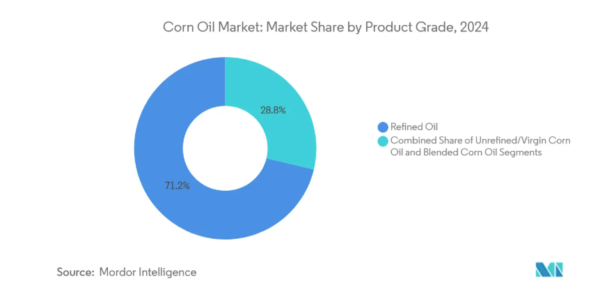 2024年、精製コーン油は市場シェアの71.24%を占め、食品メーカーが多様な用途で一貫した性能を発揮する標準化製品を好む傾向を裏付けています。精製工程は不純物や遊離脂肪酸を効果的に除去し、加工食品の保存安定性を確保するとともに風味の中立性を保証します。産業ユーザーは特にバイオディーゼル生産において、安定した脂肪酸プロファイルが信頼性の高いエステル交換反応と燃料品質規格の遵守に不可欠であることから、これらの精製グレードを顕著に好みます。一方、未精製およびバージンコーン油のセグメントは最も急速な成長を見せており、2030年までに8.32%のCAGR(年平均成長率)を誇ります。この急成長は主に、健康を優先する市場や特殊食品用途におけるプレミアムなポジショニングに起因しています。