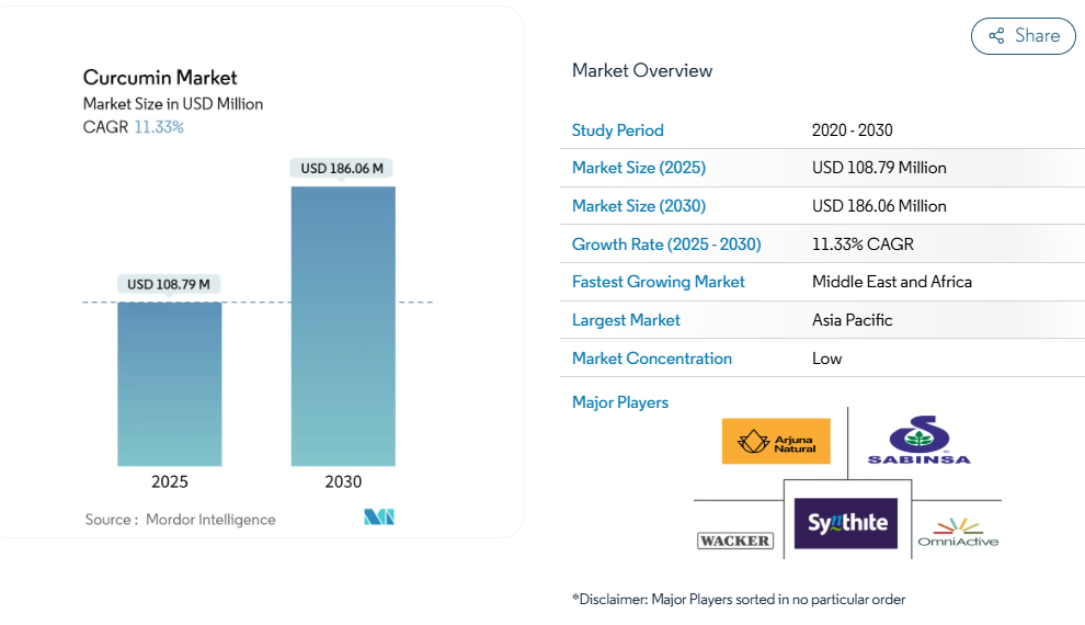 主要メーカーは、原材料サプライヤーに近いこと、およびインド産ウコンのクルクミン含有量が比較的高いことから、そのほとんどがアジア太平洋地域に集中しています。さらに、産業各社はグローバル市場における消費者層の拡大を目指し革新的な製品開発を進めており、これがビジネス環境の活性化に寄与しています。クルクミン市場における主要企業としては、アルジュナ・ナチュラル社、サビンサ社、シンタイト・インダストリーズ社、オムニアクティブ・ヘルス・テクノロジーズ社、ワッカー・ケミー社が挙げられます。