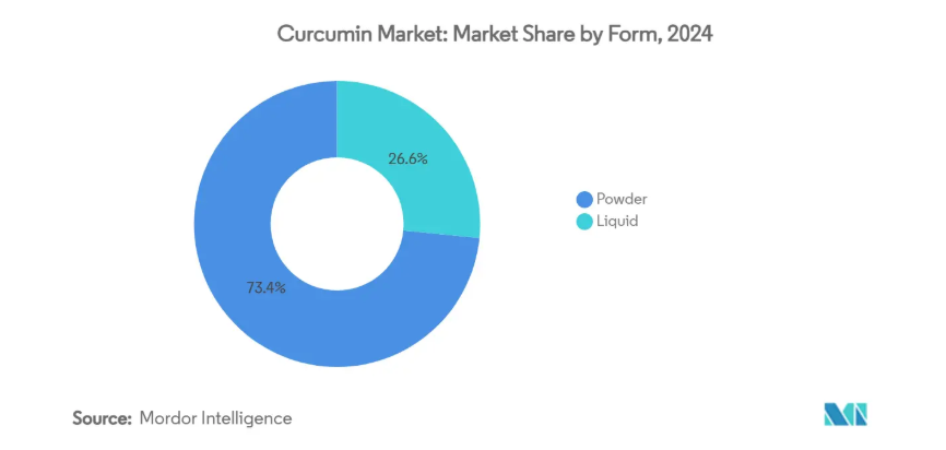 化粧品・パーソナルケア分野は、2025年から2030年にかけて年平均成長率12.70%で拡大が見込まれ、最も成長が著しい応用領域です。美容ブランドは、抗酸化保護、抗炎症特性、天然着色能力など、クルクミンの多機能的な利点を活用しています。プレミアム美容ブランドは、クルクミンの伝統的な魅力と科学的裏付けを活用し、従来の食品やサプリメント用途と比較して高い利益率を実現する差別化されたアンチエイジング製品を開発しています。この分野は、栄養補助食品に比べて比較的緩やかな規制要件の恩恵を受けており、天然成分と伝統医学の遺産を中心としたプレミアムなポジショニングとストーリーテリングの機会を提供しています。