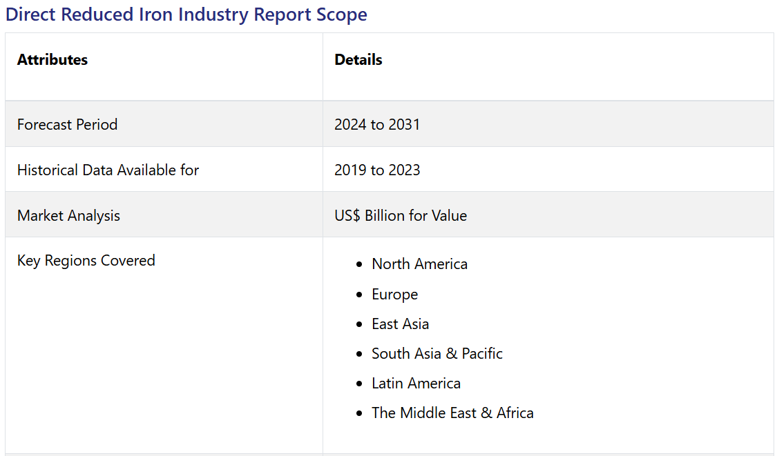 Direct Reduced Iron Market by Process Type (MIDREX, HYL/ ENEGIRON, PERED, and Rotary Kiln), Product Type (HBI, HDRI, CDRI), and Region for 2024 to 2031