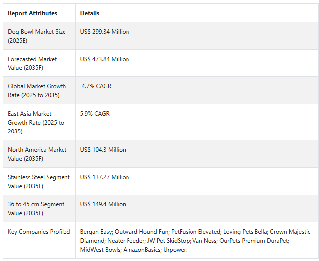 Fact.MRの最新分析によると、ドッグボウル市場は2025年に2億9,934万米ドルと評価されます。同市場はさらに2035年まで年平均成長率4.7%で推移し、2035年末には4億7384万米ドルの評価額に達すると予測されています。