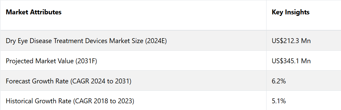 今後、市場は成長軌道を維持すると予測されています。この成長を促進する要因としては、人口の高齢化、環境要因によるドライアイ疾患の増加、スクリーンを見る時間の増加、治療用機器の継続的な技術進歩などが挙げられます。