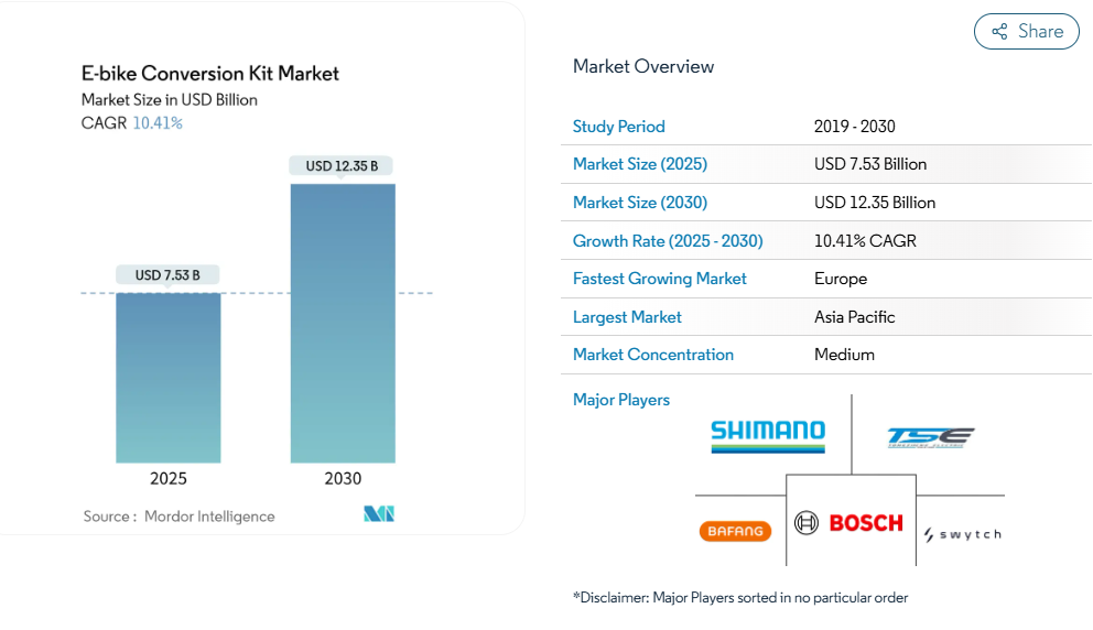 電動自転車改造キット市場は中程度の集中度を示しており、確立されたプレイヤーが技術的差別化と流通ネットワークの優位性を通じて大きな市場シェアを維持しています。主要企業は、垂直統合型モーター・バッテリープラットフォーム、特許取得済みの制御アルゴリズム、グローバルサービスネットワークを活用し、シェアを守りつつミッドドライブや貨物用途への展開を進めています。