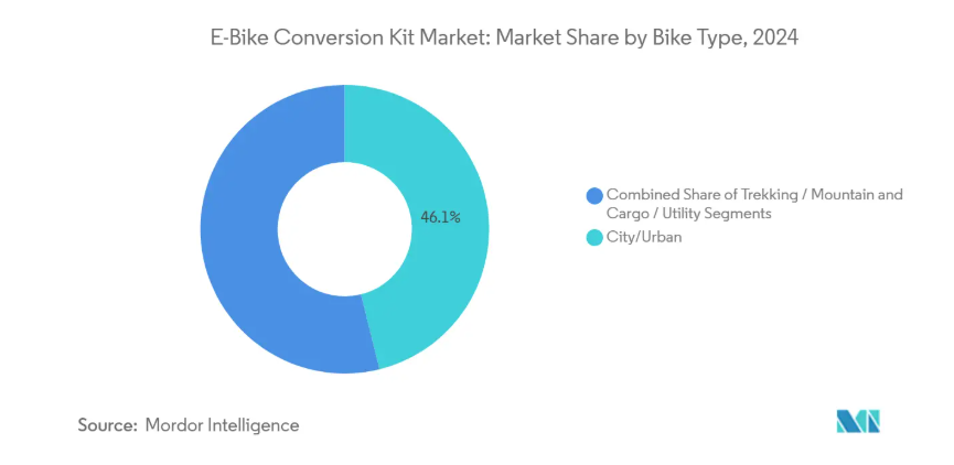 2024年における都市型自転車向け電動化改造キット市場規模は46.16%のシェアを占め、日常的な実用用途の優位性を示しています。配送プラットフォームがラストマイル車両の電動化を進める中、貨物・実用型が最も成長著しいニッチ市場となり、14.08%のCAGRで拡大しています。低排出ゾーンで内燃機関バンが規制される都市部や、マイクロハブが短距離配送を可能にする地域では導入が加速しています。キット供給業者は、積載量や頻繁な発進・停止を伴う走行特性に対応するため、頑丈なラック、トルク感知型ミッドドライブ、自動変速ハブなどを用いた製品を提供しています。