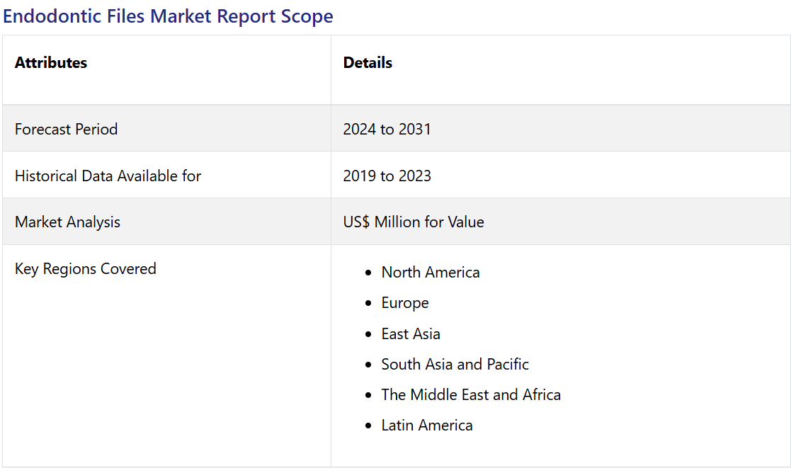Endodontic Files Market by File Type (Nickel Titanium, Stainless Steel), Treatment (Manual, Rotary), End Users (Hospitals, Dental Clinics, Academics and Research Institutes), and Regional Analysis from 2024 to 2031