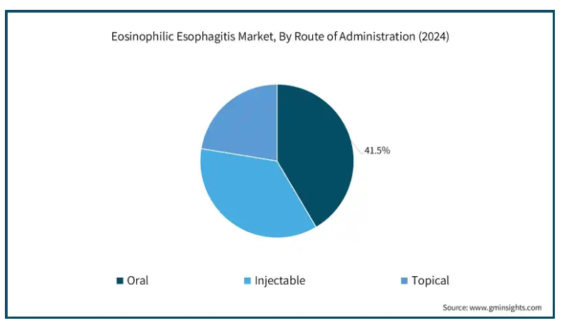 投与経路に基づき、好酸球性食道炎市場は注射剤、経口剤、注射剤、外用剤に分類されます。2024年の市場シェアは経口剤が41.5%で最多。