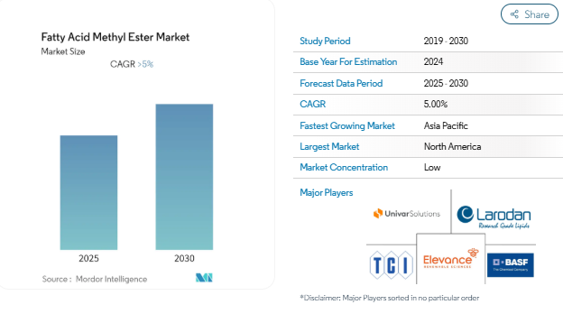 脂肪酸メチルエステル市場は予測期間(2025-2030年)に5%を超えるCAGRを記録すると予測されています。