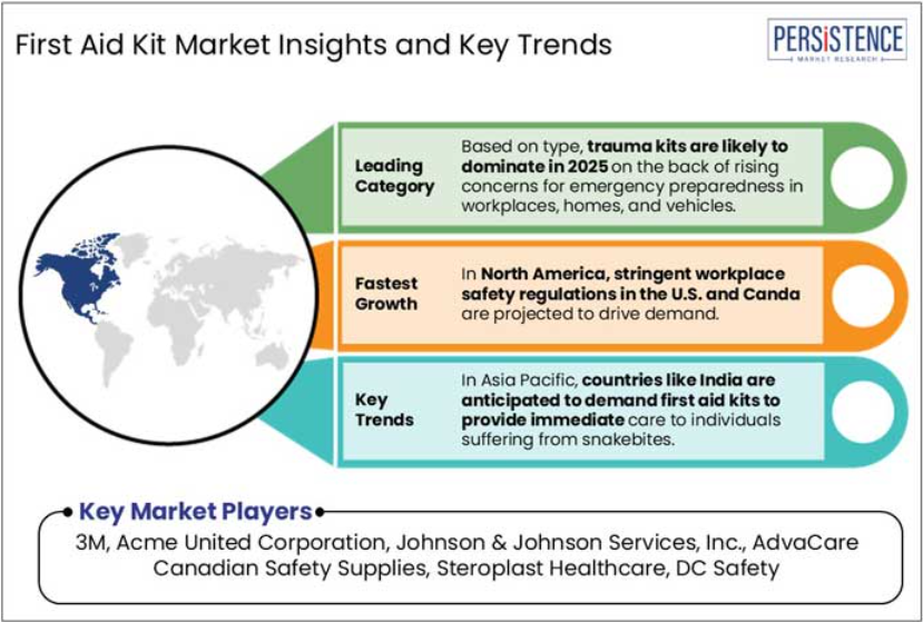 - 種類別では、職場、家庭、自動車における緊急事態への備えに対する関心の高まりを背景に、外傷用キットが2025年に28.2%のシェアを占める見通しです。
