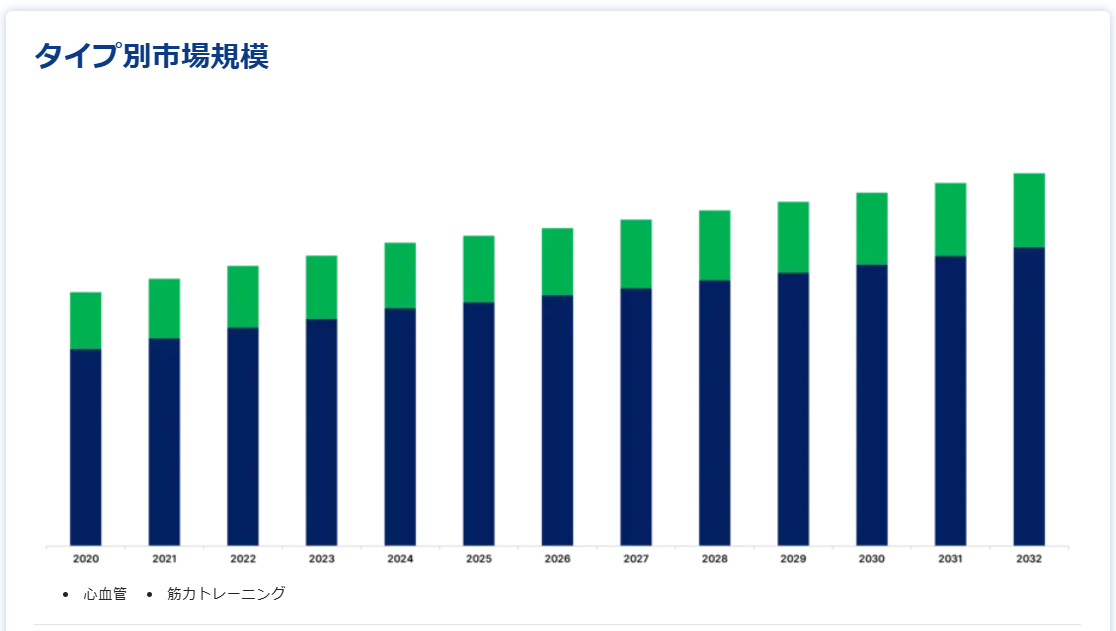 フィットネス機器の世界市場は、カーディオ、筋力トレーニング機器、その他のトレーニング機器に二分される。