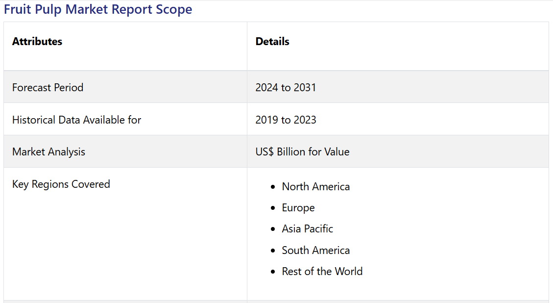 Fruit Pulp Market by Fruit Type (Mango, Apple, Guava, Banana, Pineapple, Strawberry, Papaya, Tomato, and Others), Distribution (E-Commerce, Convenience Stores, Supermarkets/Hypermarkets, Specialty Stores, and Others), Application (Food, Beverages), and Region for 2024 to 2031