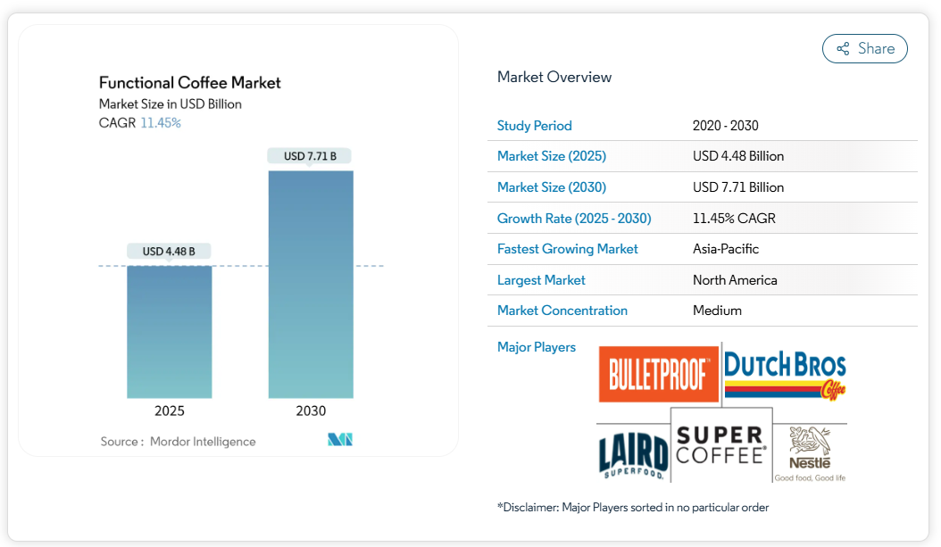 世界の機能性コーヒー市場は2025年に44億8,000万米ドルに達し、2030年までに年平均成長率(CAGR)11.45%で成長し、77億1,000万米ドルに達すると予測されています。市場拡大の背景には、従来型のカフェイン効果を超えた健康効果を提供する飲料への消費者嗜好の高まりがあります。2024年にはレディ・トゥ・ドリンク(RTD)形式が68.88%の市場シェアを占め、2030年まで12.53%のCAGRで最高成長率を維持すると予測されています。