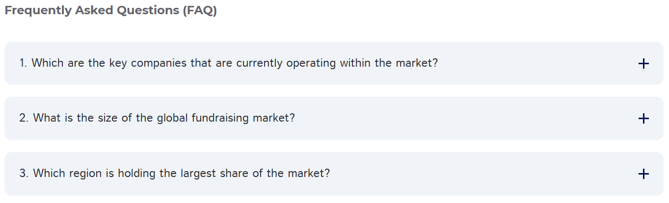 この調査レポートは、さまざまなセグメントと地域を基に世界の募金市場を分類し、各サブ市場の収益成長予測とトレンド分析を行っています。このレポートでは、世界的な資金調達市場に影響を与える主な成長促進要因、機会、課題を分析しています。市場における競争状況を明らかにするために、最近の市場動向や、拡大、新製品発売、開発、提携、合併、買収などの競争戦略も盛り込まれています。このレポートでは、世界的な資金調達市場の各サブセグメントにおける主要な市場参加者を戦略的に特定し、そのプロフィールを作成するとともに、その中核能力を分析しています。