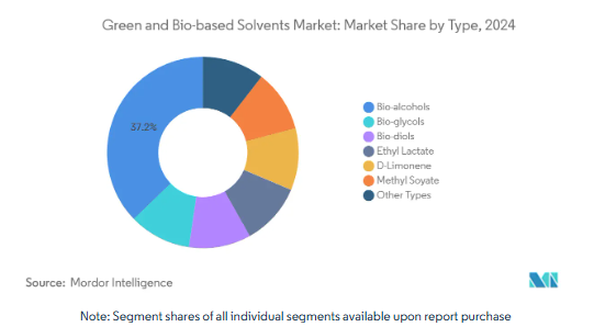 バイオアルコールは2024年に最大の売上高を生み出し、グリーン・バイオベース溶剤市場で37.2%のシェアを獲得。成熟したエタノール発酵槽、広範な農業原料供給、柔軟な下流混合ラインがこの地位を支えています。乳酸エチルのCAGR 9.56%は、優れた溶解力と生分解性を持つニッチ分子への軸足を強調しています。