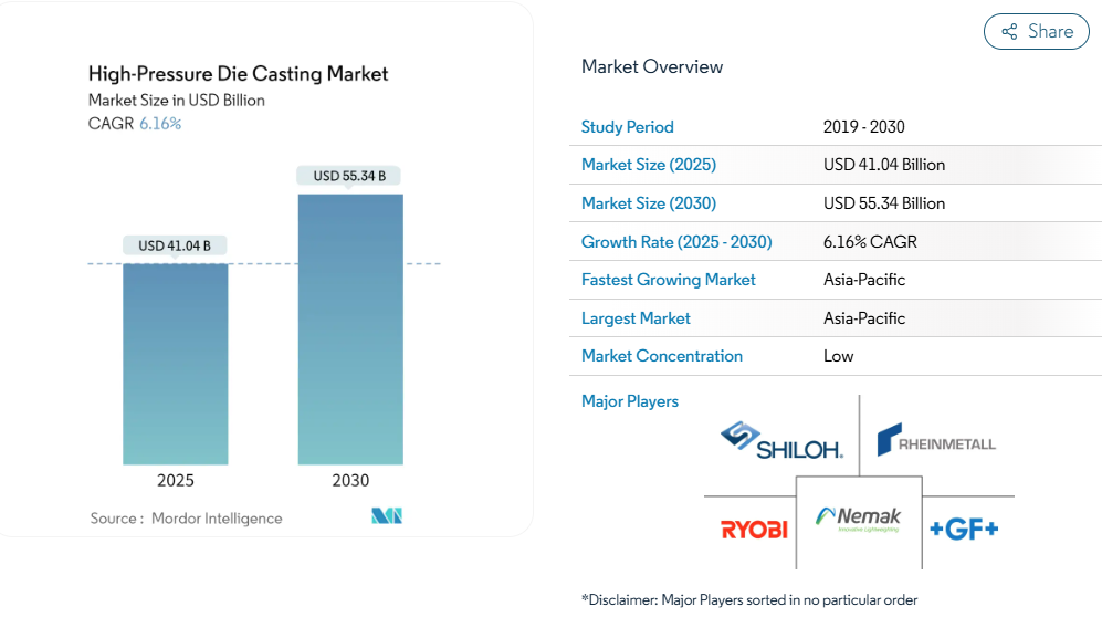 世界のダイカスト市場は、大規模な多国籍企業と地域専門企業が混在する分散型の競争構造を示しています。ネマック、ゲオルグ・フィッシャー・オートモーティブ、ラインメタルAGといった主要な認知企業は、広範な製造ネットワークを通じて世界的に大きな存在感を維持していますが、特にイタリア、ドイツ、米国、インド、中国などの地域企業は、それぞれの地域で相当な市場シェアを合わせて保持しています。業界では、地理的範囲と技術能力の拡大を図る企業による合併・買収を通じた統合が進んでいます。発展途上国の中小企業が多数市場に参入し、競争を激化させるとともに製造プロセスの革新を促進しています。