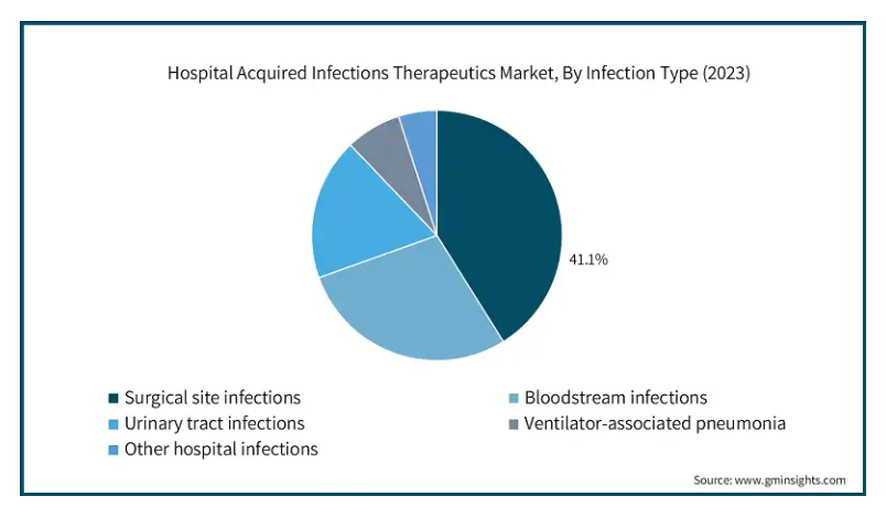 病院内で発症する感染症を治療する薬剤の院内感染治療薬市場は、手術部位感染、血流感染、尿路感染、人工呼吸器誘発性肺炎など、感染症の種類別に細分化されています。2023年の推定売上高は52億アメリカで、手術部位感染症が主要セグメント。