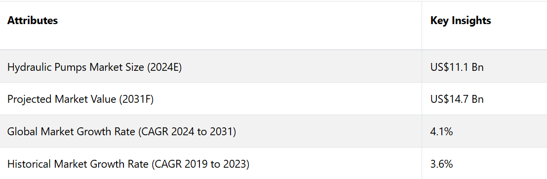 世界の油圧ポンプ市場は、2024年の111億米ドルから2031年末までに147億米ドルに増加すると予測されています。2024年から2031年の予測期間において、市場は年平均成長率(CAGR)4.1%で拡大すると予測されています。