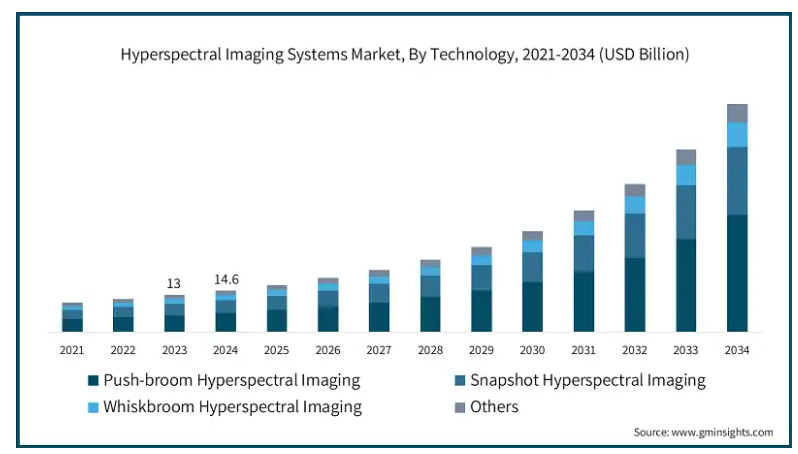 小型・軽量で持ち運び可能なハイパースペクトルカメラに対する需要の高まりにより、ドローン、UAV、携帯型アプリケーションに最適なプッシュブルームセンサやスナップショットセンサなど、センサ技術が大幅に進歩しました。