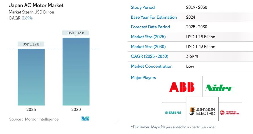 日本ACモーター市場の規模は2025年には11億9000万米ドルと推定され、予測期間(2025年~2030年)中の年間平均成長率(CAGR)3.69%で成長し、2030年には14億3000万米ドルに達すると予測される。