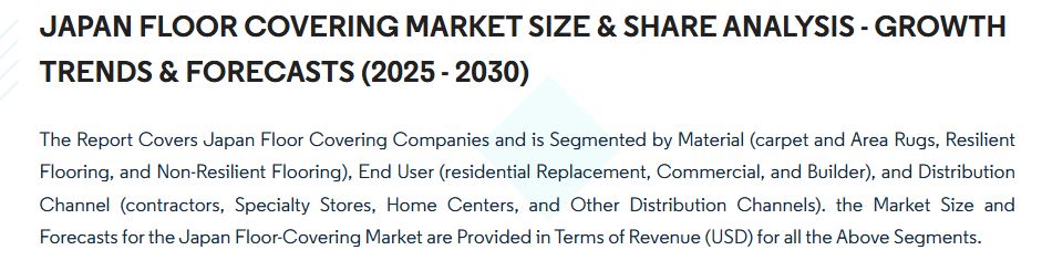 本市場レポートは日本の床材企業をカバーしており、素材(カーペットおよびエリアラグ、弾性床材、非弾性床材)、エンドユーザー(住宅用交換、商業用、建設業者)、流通チャネル(請負業者、専門店、ホームセンター、その他の流通チャネル)別に区分されています。日本の床材市場の市場規模と予測は、上記のすべての区分について、収益(米ドル)ベースで提供されています。