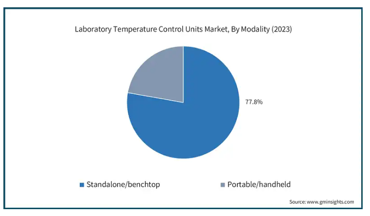 実験室用温度制御ユニット市場は、モダリティに基づき、スタンドアロン/ベンチトップ型とポータブル/ハンドヘルド型に二分されます。ポータブル/ハンドヘルド型セグメントは、予測期間中にCAGR 6%で力強い成長を記録すると予測されています。