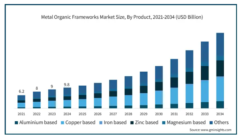有機金属骨格の世界市場規模は2024年に98億米ドルとなり、2025年から2034年までの年平均成長率は14.2%を超えると予測されています。