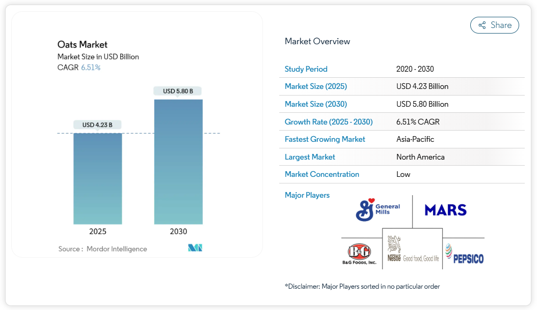 世界のオート麦市場は、2025年に42億3,000万米ドルと評価され、2030年までに58億米ドルに達すると予測されており、年平均成長率(CAGR)6.51%で成長しています。この成長は主に、栄養価が高くグルテンフリーの穀物に対する消費者需要の高まりによって牽引されており、米国食品医薬品局(FDA)による食品表示におけるグルテン含有量≤20ppmの基準値に関する規制の明確化がこれを後押ししています。この規制により、製造業者はセリアック病やグルテン過敏症の消費者のニーズに確信を持って対応できるようになり、市場機会がさらに強化されています。北米市場は、確立された朝食シリアル消費習慣を背景に安定した成長を続けております。