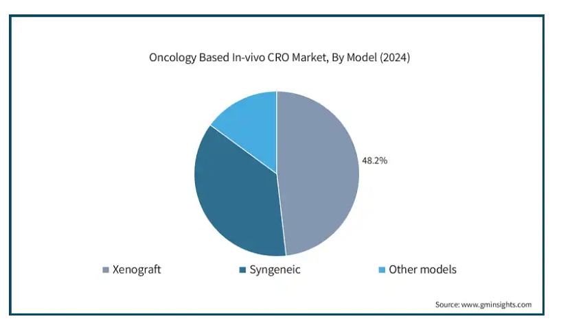 モデルに基づいて、オンコロジーに基づくin-vivo CRO市場は、異種移植、シンジェニック、その他のモデルにセグメント化されます。異種移植片はさらに、患者由来異種移植片、細胞株由来異種移植片、その他の異種移植片に細分化されます。2024年のがんベースの生体内CRO市場では、異種移植片セグメントが48.2%と圧倒的なシェアを占めています。