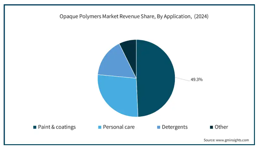 用途に基づき、市場は塗料・コーティング、パーソナルケア、洗剤、その他に区分されます。塗料・コーティングの2024年の市場規模は17億米ドルで、予測期間中の年平均成長率は10.6%と予想されています。塗料・コーティング分野は、塗料の品質と性能を向上させる不透明ポリマーの広範な採用により、市場シェアの大部分を占めています。これらのポリマーは隠ぺい力、耐久性、耐候性の向上に貢献し、建築用塗料や自動車用塗料に不可欠な存在となっています。