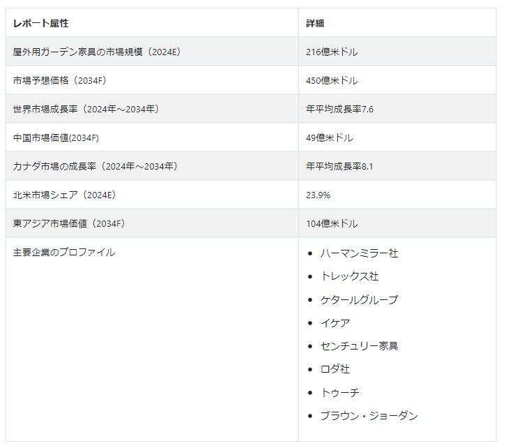 市場調査レポート:屋外用ガーデン家具の市場展望(2024年〜2034年)~素材別、販売チャネル別 、製品タイプ別、地域別