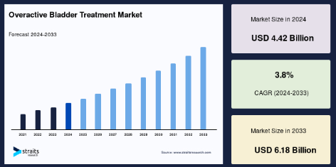 過活動膀胱(OAB)は、予期せぬ頻尿を引き起こす疾患です。過活動膀胱は、膀胱に尿があまり溜まっていないときでも筋肉が激しく収縮し始めると発症します。この不随意収縮が突然の尿意を引き起こします。日中も夜間も頻繁に尿意を感じたり、意図せずに尿が出たりすることがあります(切迫性尿失禁)。膀胱が収縮するため、トイレにたどり着くまでの時間が短いか、まったくありません。この症状は切迫性尿失禁とも呼ばれます。高齢化人口の増加、糖尿病人口の増加、過活動膀胱の有病率の継続的な上昇、アルコールやカフェイン飲料の消費量の増加、多発性硬化症やパーキンソン病などの神経疾患は、過活動膀胱治療市場の成長に大きく貢献しています。