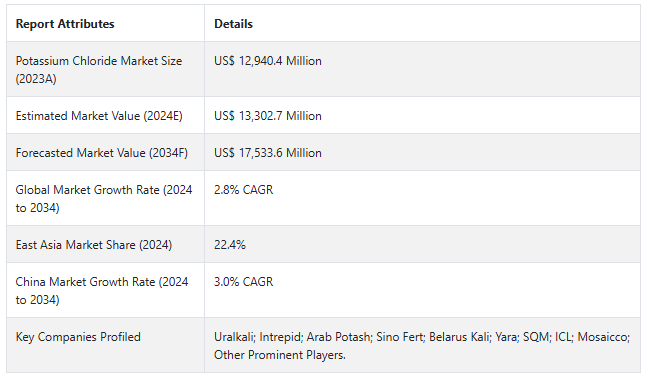 最終用途産業の成長に伴い、塩化カリウム市場は2024年から2034年の予測期間中にCAGR 2.8%で成長すると予測されています。