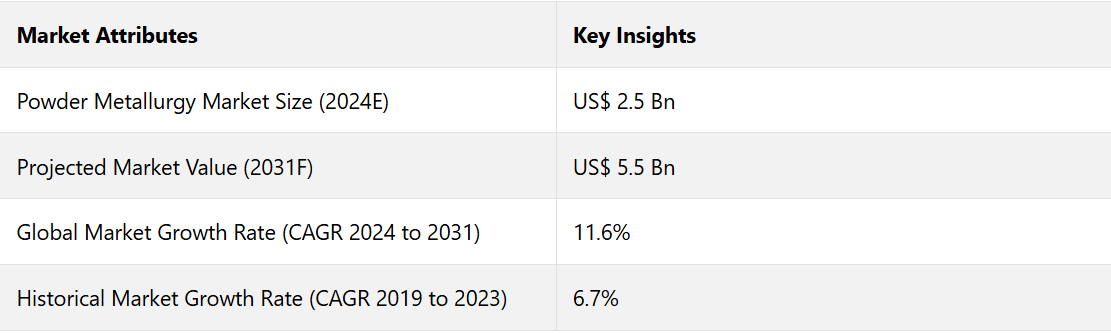 粉末冶金市場は、歴史的期間に年平均成長率(CAGR)6.7%で成長すると予測される。期間中の成長は、特に軽量および高性能部品に対する自動車セクターの需要によって著しく促進された。