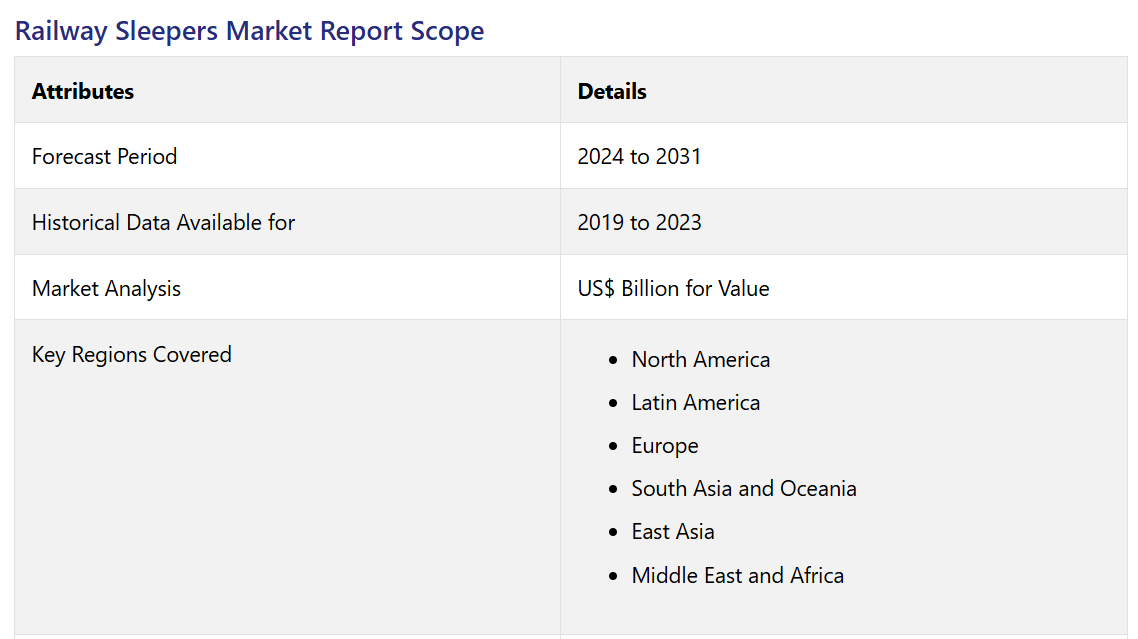Railway Sleepers Market by Material (Wood, Concrete, Composite, Steel), Track Type (Tangents, Turnouts, Bridges, Tunnels), Line Type (Main Line, Transit, Industrial), Application (Heavy Haul Railways, High-speed Railways, Urban Transit Systems, Regional and Commuter Railways), and Regional Analysis from 2024 to 2031