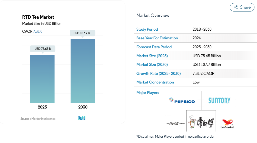 RTD茶市場では、ペプシコ、コカ・コーラ社、ティンイー・ホールディング、ユニ・プレジデント・エンタープライズといった有力企業が競争環境をリードしております。製品革新は依然として重要な戦略的焦点であり、各社は変化する消費者の嗜好に応えるため、新たなフレーバー、機能性成分、より健康的なバリエーションを継続的に導入しております。最先端の製造施設への投資や、特にリサイクル可能なPETボトルやエコフレンドリーな素材といった持続可能な包装ソリューションの採用を通じて、事業運営の俊敏性が示されています。各社は市場での存在感と流通能力を強化するため、現地の流通業者、小売業者、技術プロバイダーとの戦略的提携を積極的に推進しています。地理的拡大戦略では、新興市場への進出に注力すると同時に、買収や合弁事業を通じて既存地域での地位強化を図っています。産業では、サプライチェーン効率の最適化とデジタルトランスフォーメーションの推進により、業務効率と顧客エンゲージメントの向上を図る取り組みが継続的に行われています。
