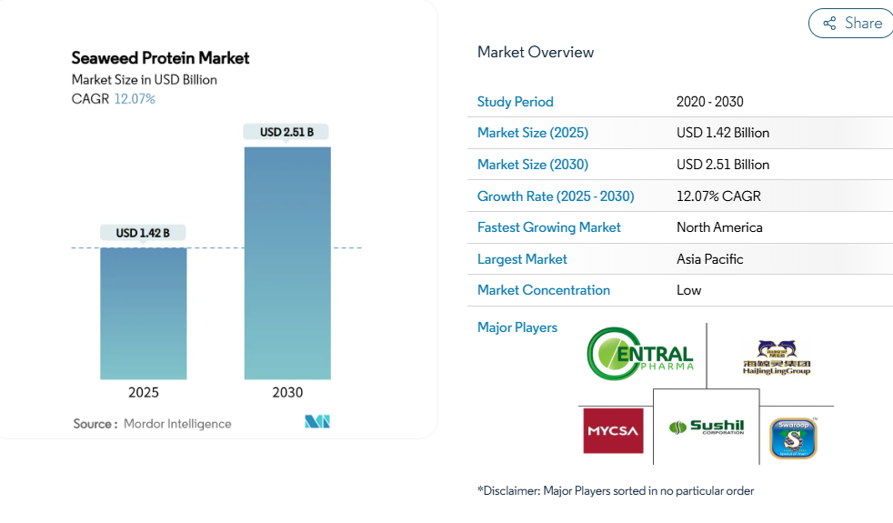 世界の海藻タンパク質市場規模は、2025年に14億2,000万米ドルと評価され、2030年までに25億1,000万米ドルに達すると予測されており、年平均成長率(CAGR)12.07%で成長しています。海藻タンパク質は乾燥重量で最大32%のタンパク質含有量を有し、生産には淡水、肥料、耕作地を必要としないなど、最小限の環境資源で済みます。