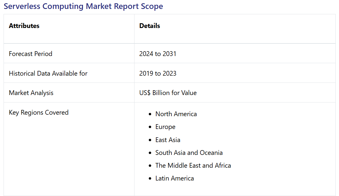 Serverless Computing Market by Server Type (Compute, Serverless Storage, Serverless Database, Application Integration, Monitoring & Security), Service Model (Function-as-a-service (FaaS), Backend-as-a-service (BaaS)), Deployment, Organization Size, Vertical, and Regional Analysis from 2024 to 2031