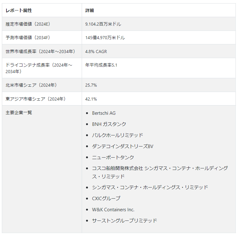 世界の輸送用コンテナ市場は、2024年に91 億 420 万米ドルの評価額を達成し、2034年には145 億 4970 万米ドルに達すると予測され、2024年から2034年までのCAGR は4.8%と予測される。
