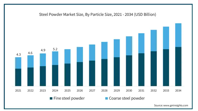 スチールパウダーの世界市場規模は2024年に52億米ドルとなり、2025年から2034年にかけて年平均成長率6.1%以上で成長すると予測されています。