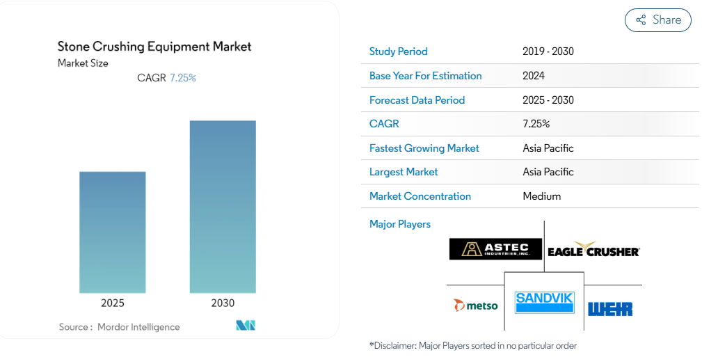 砕石設備市場は、予測期間中に年平均成長率(CAGR)7.25%を記録すると見込まれております。