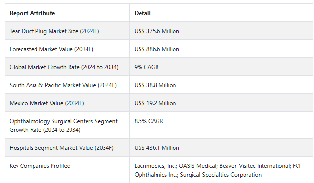 涙道プラグの世界市場規模は、2024年に3億7560万米ドル。さらに、年平均成長率(CAGR)9%で上昇し、2034年には8億8660万米ドルに達すると予測されています。