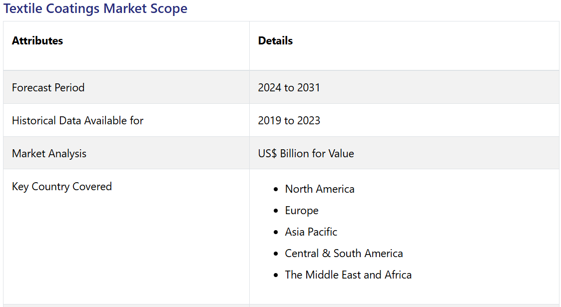 Textile Coatings Market by Polymer Type (Thermoplastics, Thermosets, Other Polymer Types), End Use (Transportation, Building & Construction, Protective Clothing, Industrial, Medical, Other End Uses), and Region for 2024 to 2031