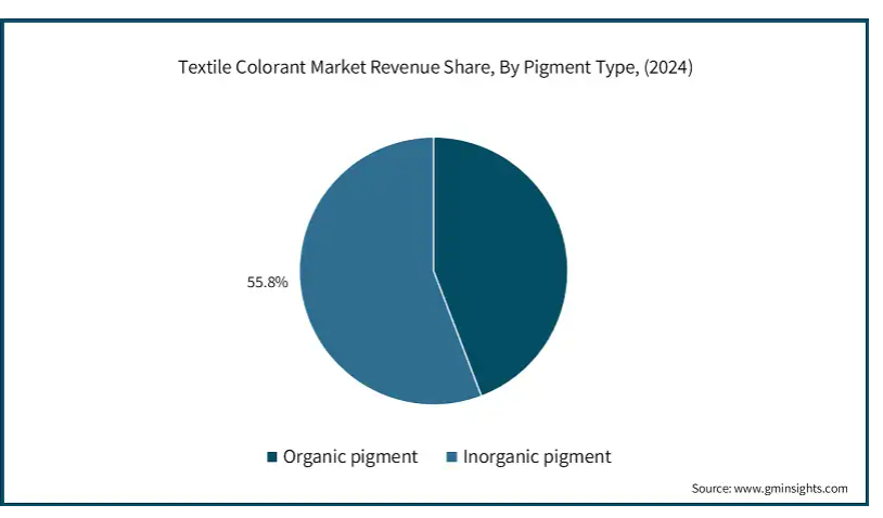 顔料の種類別では、市場は有機顔料と無機顔料に区分されます。無機顔料は、市場で55.8%の支配的な市場シェアを占めています。無機顔料は、その優れた色安定性と熱や光に対する弾力性により、繊維着色剤市場を支配しています。二酸化チタン、酸化鉄、クロム化合物などのこれらの顔料は、優れた堅牢度と様々な環境条件下で色相を維持する能力で非常に好まれており、屋外用テキスタイルや長持ちする色を必要とする製品に最適です。また、無機顔料は有機顔料に比べて費用対効果が高く、大量生産の繊維製品に広く採用されています。無機顔料は、耐久性のある色を必要とするポリエステル、綿混紡、デニムの染色に特に効果的です。さらに、その無害な性質と環境安全性は、増加する規制要件と一致しており、ファッションと工業用繊維の両方の分野で強力な市場地位を固めています。