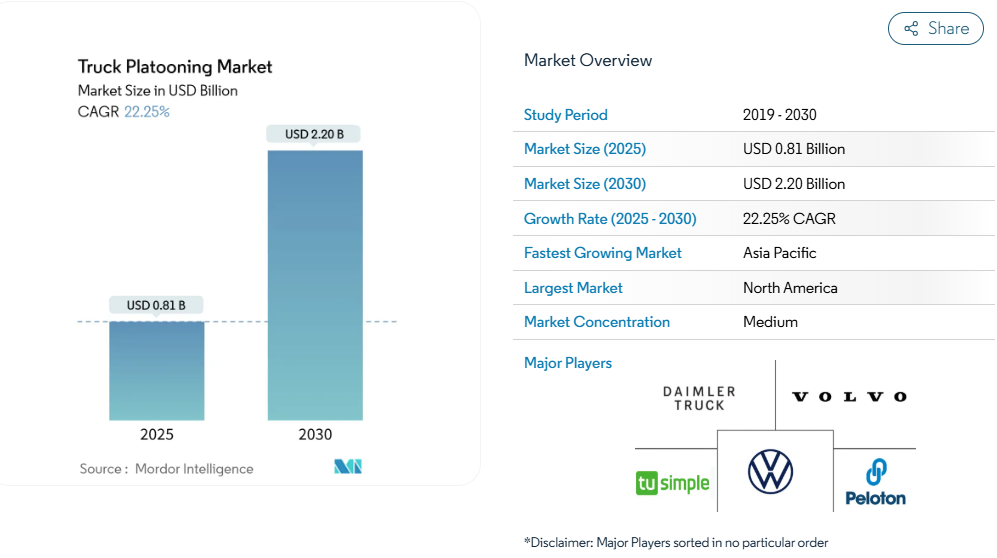 トラック・プラトーニング市場の規模は2025年に8億1000万米ドルに達し、2030年までに22億米ドルに達すると予測されており、年平均成長率(CAGR)22.25%で拡大しています。より厳格な温室効果ガス規制、十分な資金が投入された回廊プログラム、そして5G対応のV2X規格により、プラトーニングはもはやオプションの効率化追加機能ではなく、脱炭素化の核心的な手段として位置づけられています。