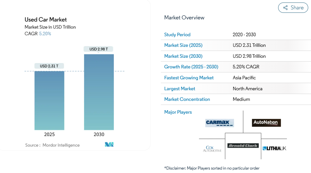 中古車市場は2025年に2兆3100億米ドルと評価され、2030年までに2兆9800億米ドルに達すると予測されており、これは着実な年平均成長率(CAGR)5.20%に相当します。この成長軌跡は、消費者へのインフレ圧力やサプライチェーンの変動にもかかわらず、中古車市場が依然として堅調であることを裏付けています。この成長は、新車と中古車の価格差の拡大、デジタル小売プラットフォームの台頭、そして中古車購入者の品質懸念を緩和する認定中古車(CPO)プログラムの成熟によって支えられています。
