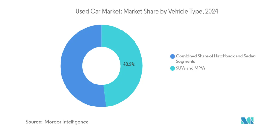 2024年時点で、SUVとMPVが中古車市場の48.21%を占めました。自動車メーカーが燃費効率と高い乗車性を兼ね備えたコンパクトクロスオーバーの新型を相次いで投入する中、このセグメントは堅調な年平均成長率9.50%で拡大が見込まれます。テスラ・モデルYやフォード・マスタング・マッハEが大量に出回っている現状は、電気SUVがこのセグメントでの主導権をさらに強めることを示唆しています。セダンは予算重視の購入者や配車サービス事業者向け車両として存在感を維持し、ハッチバックは低ランニングコストと駐車容易性を求める都市通勤者に支持されています。