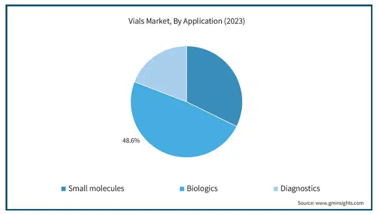バイアル市場は、用途別に低分子、生物製剤、診断薬に分類されます。生物製剤セグメントは2023年に48.6%と最も高い市場シェアを占めています。