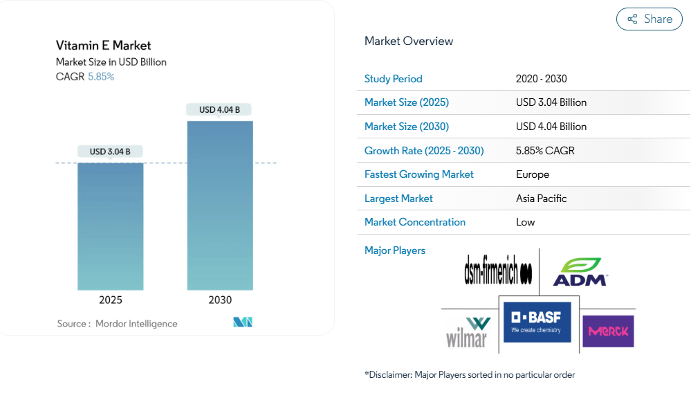 ビタミンE市場の周期的な性質と潜在的なサプライチェーンの脆弱性により、強固な運営戦略が求められます。生産能力の多様化と確立されたリスク管理システムを有する企業は、単一供給源に依存する企業に対して競争優位性を維持します。この運営上のレジリエンスは、生産中断時に特に重要性を増し、企業が一貫した市場供給を維持し、顧客の需要に効果的に応えることを可能にします。