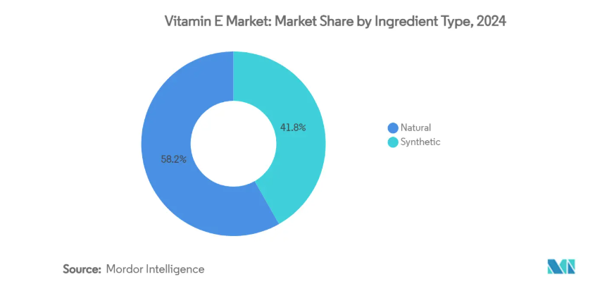 天然ビタミンEは2024年に58.23%の市場シェアを占めております。これは消費者が合成代替品よりも生体利用率の高いd-α-トコフェロールを選択する傾向が強まっているためです。天然セグメントは、クリーンラベルの潮流と天然原料に対する規制支援に支えられ、2025年から2030年にかけて年平均成長率(CAGR)6.12%で成長すると予測されております。天然ビタミンEは組織内保持率と生体活性が高く、特に効果性が購買判断に影響する栄養補助食品や化粧品分野において、プレミアム価格設定を支えています。一方、合成ビタミンEは飼料用途ではコスト優位性を維持していますが、持続可能性要件や生物学的利用能の違いに関する消費者意識の高まりという課題に直面しています。